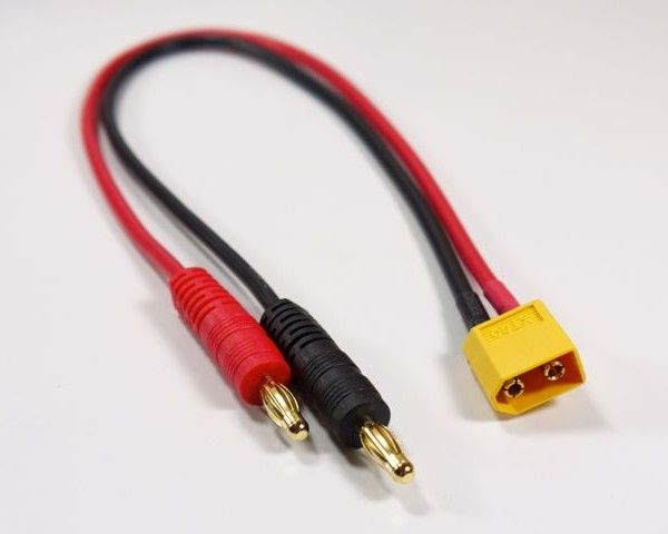 Adapter (przedłużacz) pomiędzy zarobionymi wtykami typu "Gold" 4mm a wtyczką typu XT60 pomocny przy np. ładowaniu pakietów zakończonych gniazdem typu XT60 z ładowarki procesorowej.