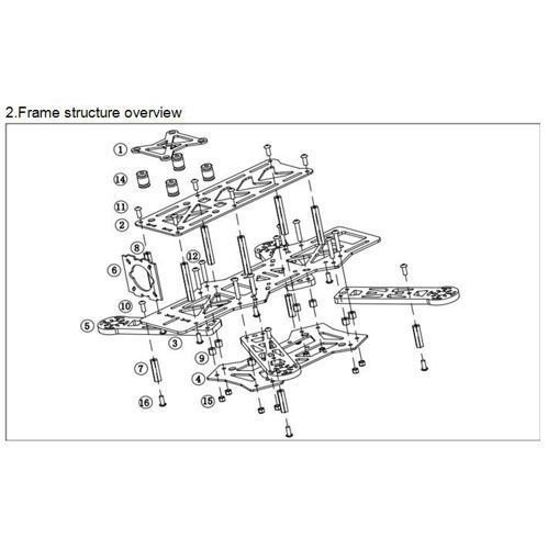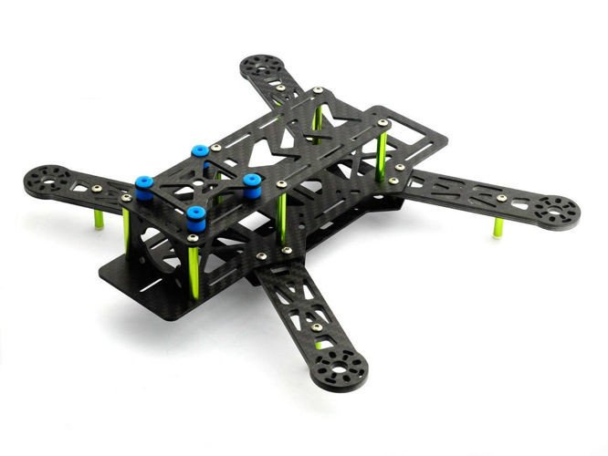 Rama quadrokoptera klasy 250 najbardziej popularnej konstrukcji wyścigowej wśród wielowirnikowców, wersja do złożenia ( szacowany czas ok 20-30 min ) Jest to wersja V2 z drobnymi zmianami, miedzy innymi otworami pod silniki mocowane na śruby M2 oraz M3, rama posiada płytkę węglową do montażu kamery niezbędnej przy lotach FPV oraz płytkę z tłumikami niwelującymi drgania dla kontrolera lub kamery używanej do rejestracji obrazu typu Mobius.