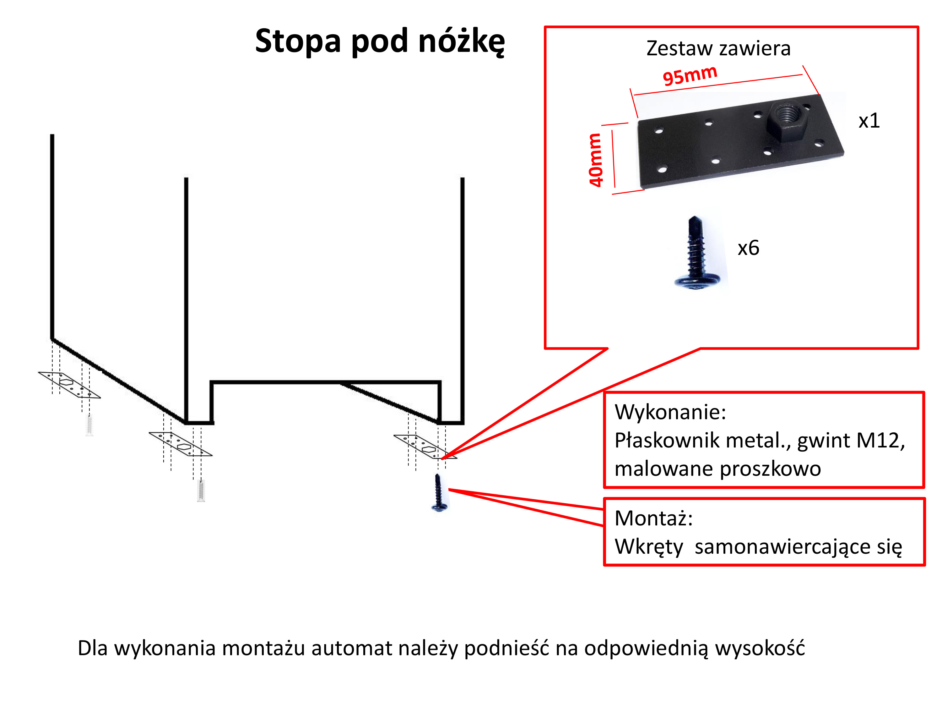 Metalowa wykonana z 3 mm płaskownika stopa pod nóżkę, czarny mat. Rozmiar 95×40 mm, wprasowana nakrętka M12 pod nóżkę.